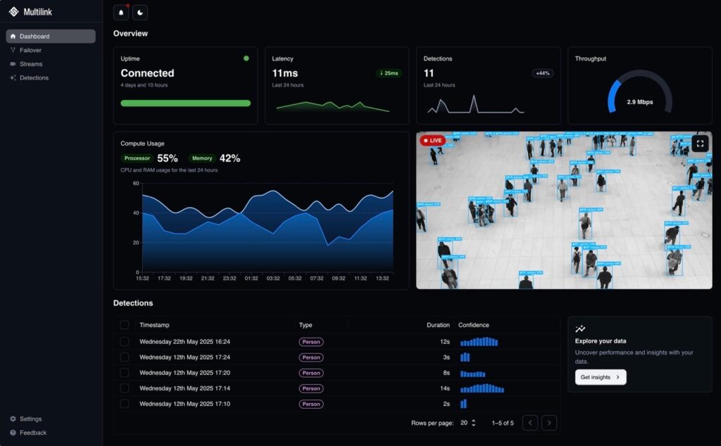 - Advanced Edge AI — operators can upload and run their own models on-device for real-time object detection, activity recognition, reasoning and video optimisation.